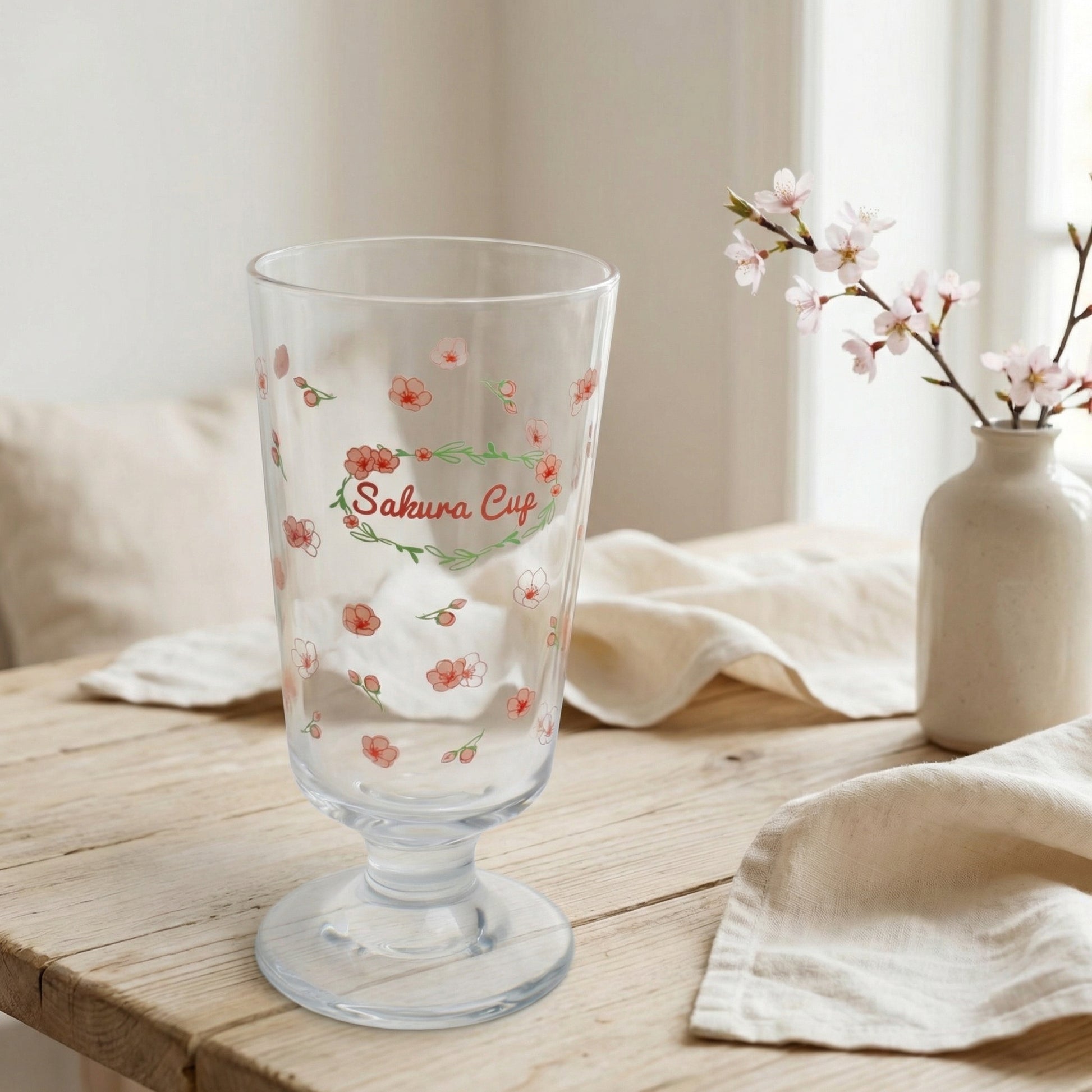 This cherry & sakura illustrated goblet glass features delicate hand-drawn patterns paired with an elegant footed design, bringing a fresh and charming touch to everyday drinks.