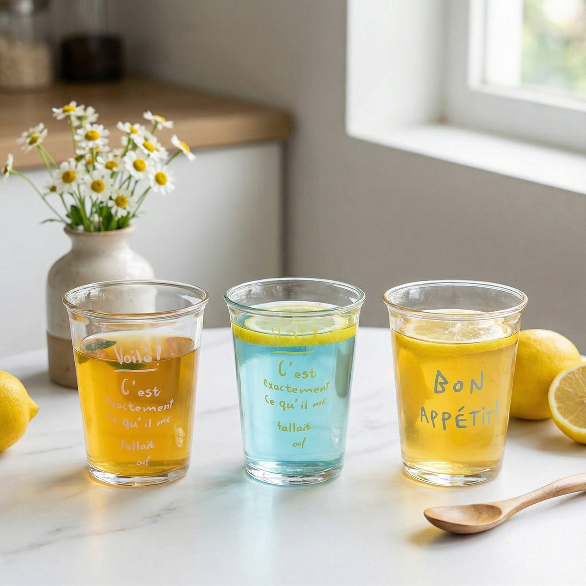 This French-style clear glass tumbler features a minimalist design with playful handwritten lettering, bringing a fresh and cozy vibe to your daily life. Perfect for water, lemonade, juice, or iced tea, it adds an effortless aesthetic touch to any table setting.