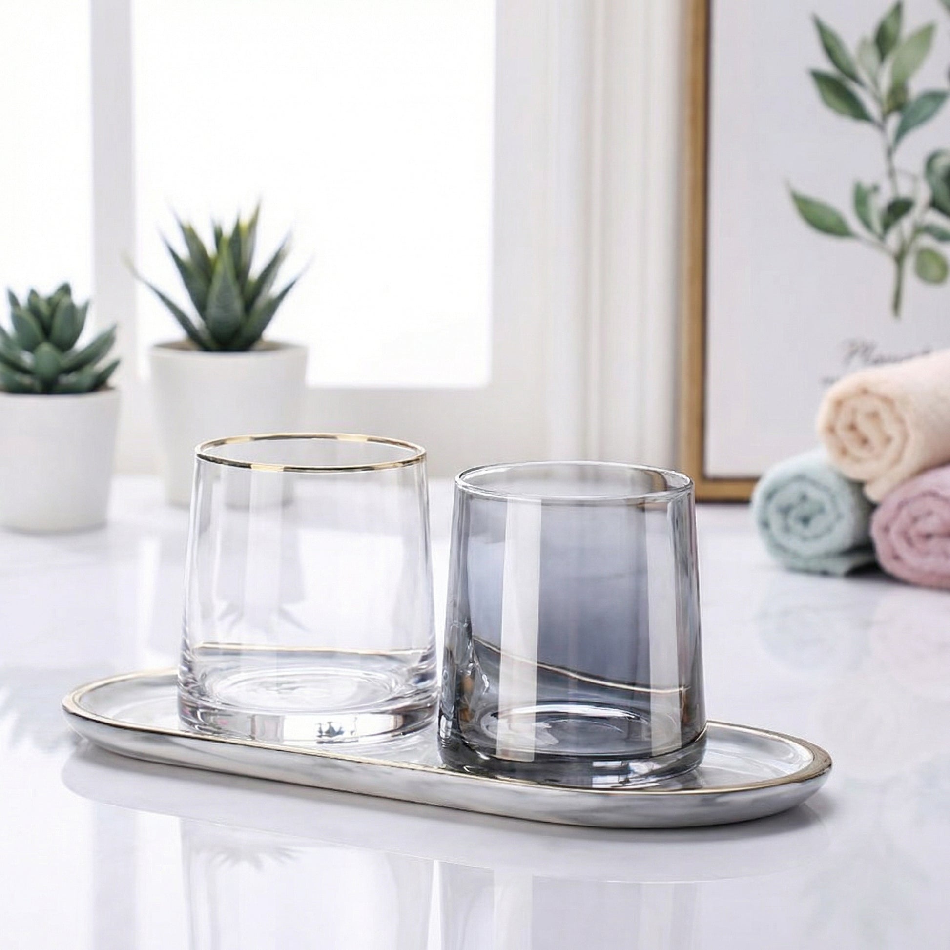 Available in clear, gold-rim, smoky gray, and iridescent finishes, each glass reflects modern elegance and understated luxury.